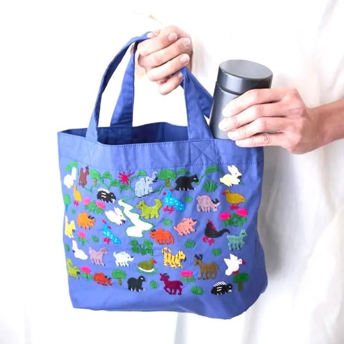 ラオスの森で暮らすかわいい動物たちがたくさん刺繍された、まるで絵本の1ページのようなラオスの森シリーズに、お弁当箱や水筒が入るランチトートが登場です。もちろん通勤や通学のサブバッグとしても使えます!
